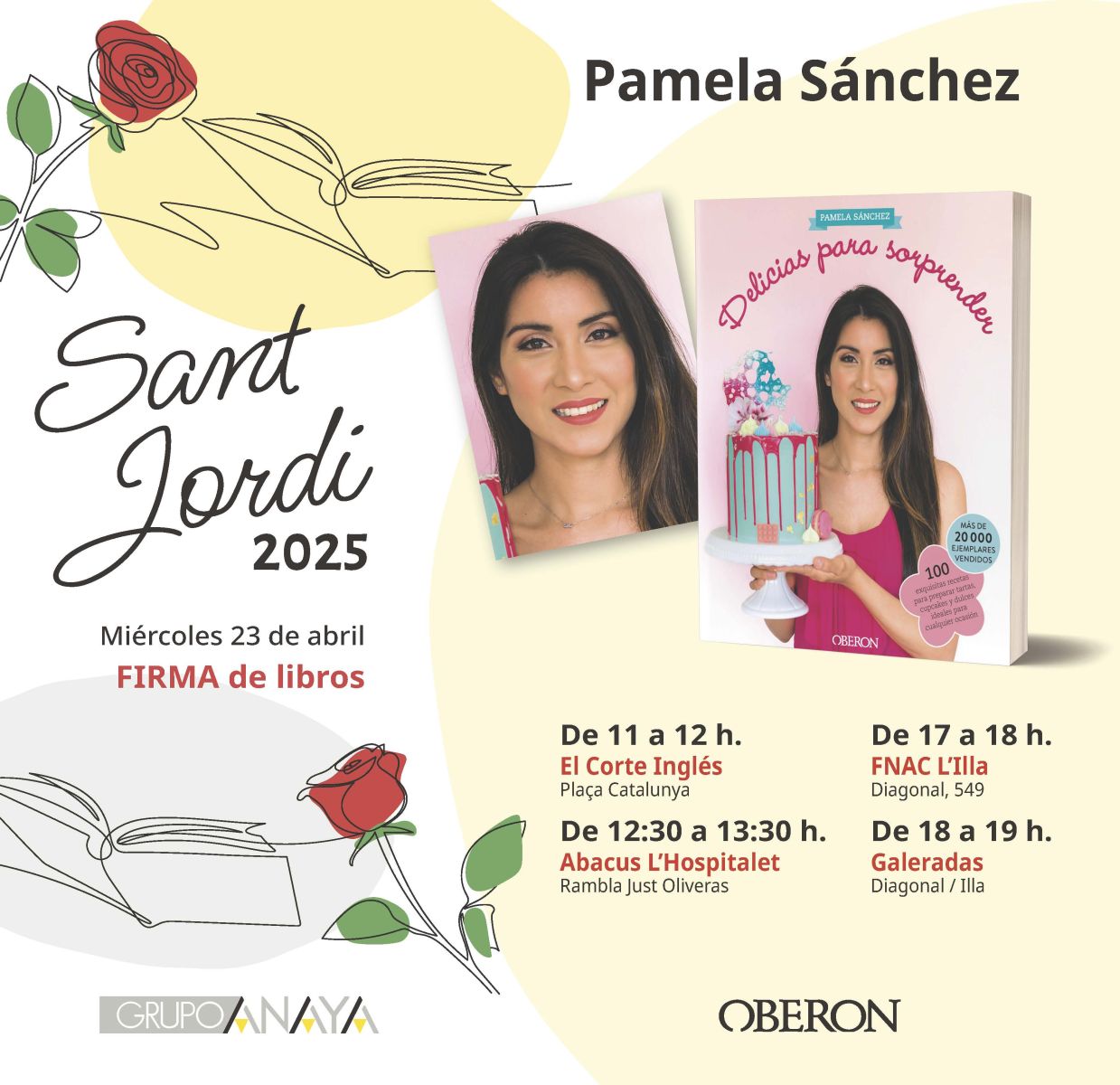 El postre final viene, como siempre, de la mano de Pamela Sánchez con su nuevo libro Delicias para sorprender. La pastelera más conocida en redes sociales vuelve con 100 nuevas recetas muy dulces para demostrar que la repostería puede ser muy sencilla. Además, Pamela también estará firmando sus libros en Barcelona por Sant Jordi, podrás conocerla en las siguientes librerías: